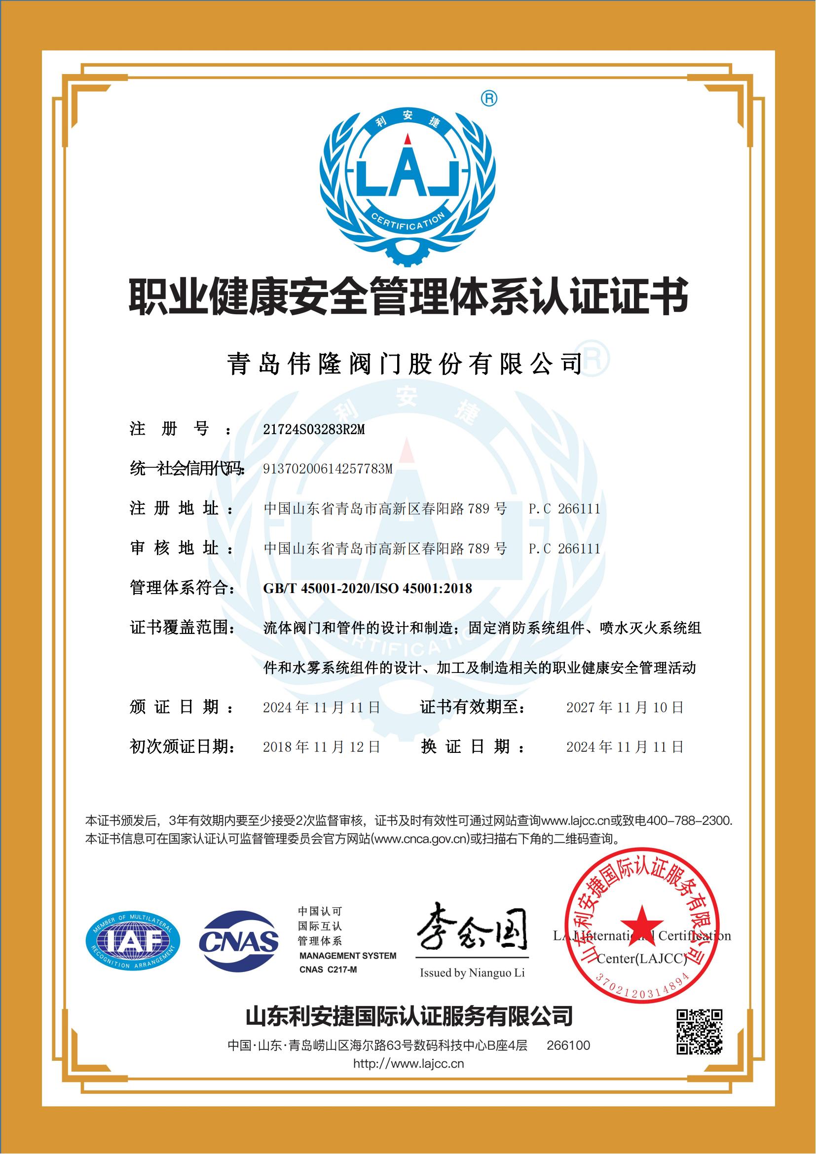 职业健康安全管理体系认证证书